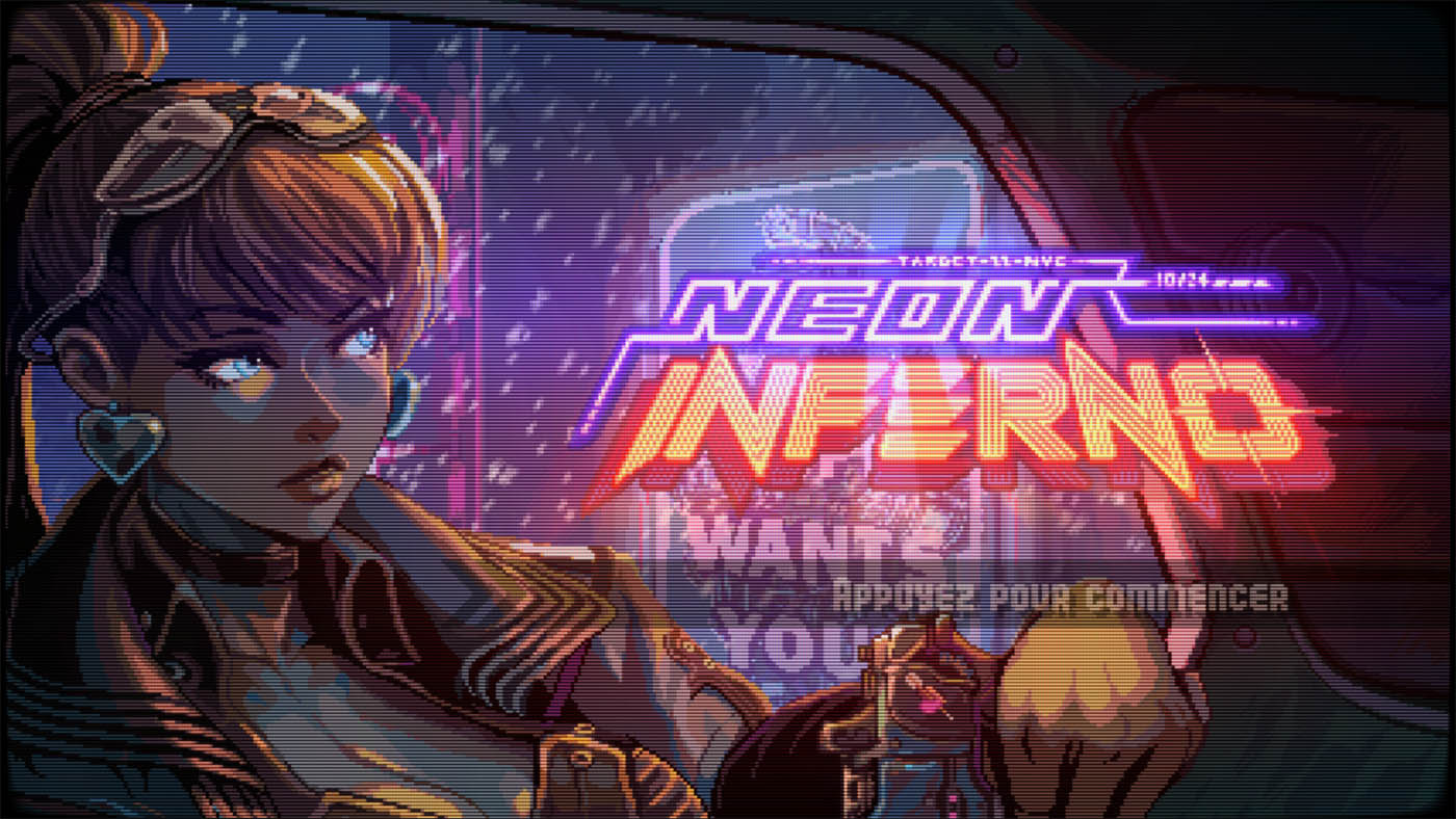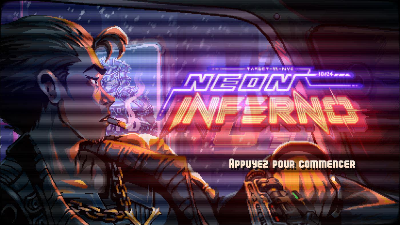 Si vous aimez les gros pixels, les effets scanline, les écrans cathodique bombés et les run’n gun nerveux et exigeants, Neon Inferno, le nouveau jeu développé par Zenovia Interactive et édité par Retroware, est le jeu qu’il vous faut. Sa difficulté élevé en fait un titre qui ne cherche pas à plaire à tout le monde. Dès les premières minutes, il impose son rythme, son esthétique et sa difficulté. C’est un jeu qui s’adresse clairement aux joueurs en quête d’action, dans la droite lignée des jeux d’arcade d’il y a 30 ans.