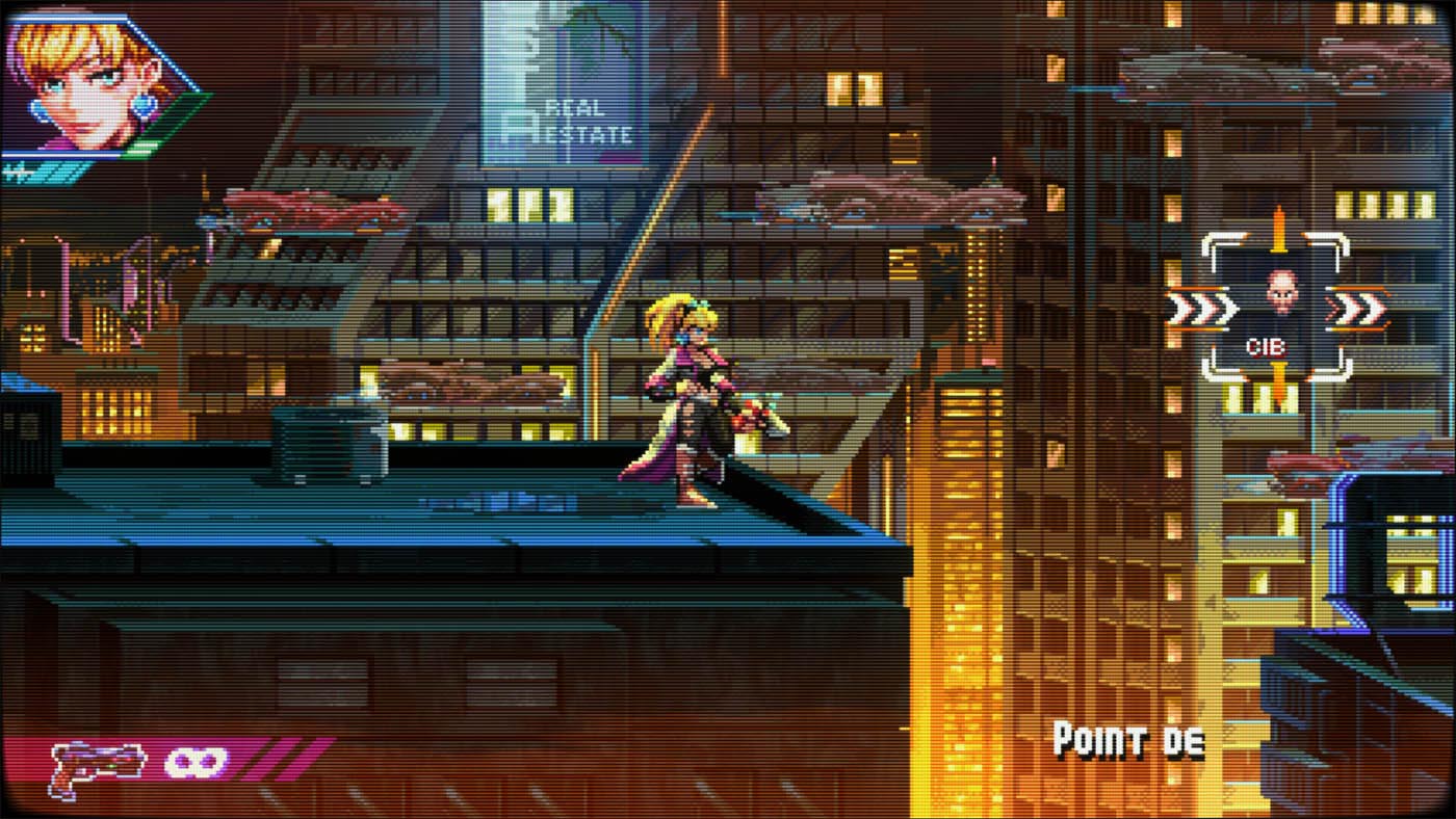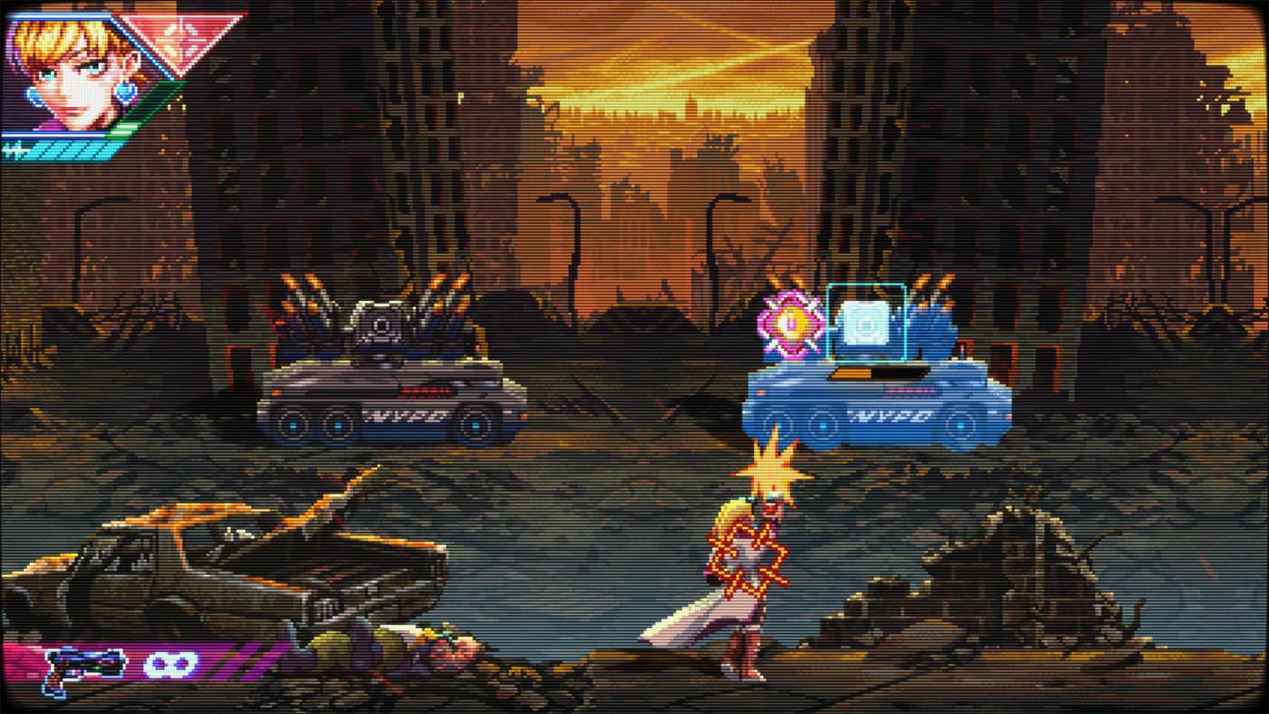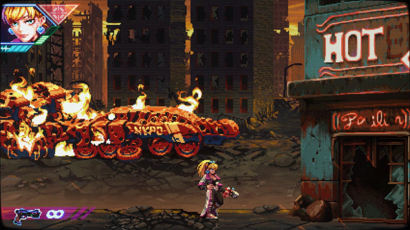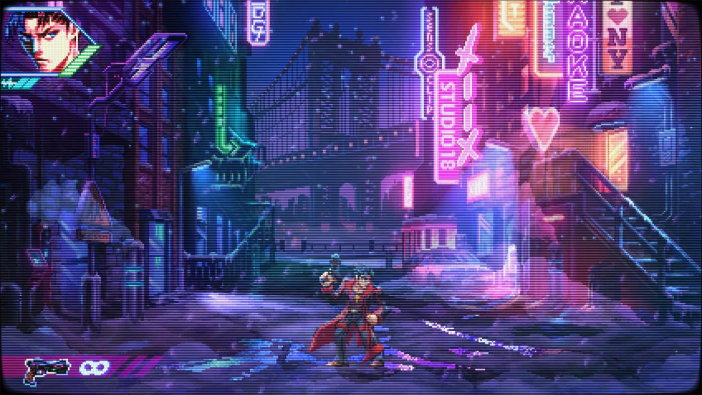 Aussitôt la première mission lancée, Neon Inferno vous jette dans le grand bain. Avec son identité visuelle délicieusement rétro rappelant certains titres aux grandes heures de la Neo-Geo et son univers cyberpunk omniprésent : Éclairages néons, décors urbains délabrés et ambiance dystopique créent une atmosphère qui ne va pas sans rappeler les jeux des années 90. Le style graphique est cohérent, lisible en pleine action et contribue fortement à l’immersion.