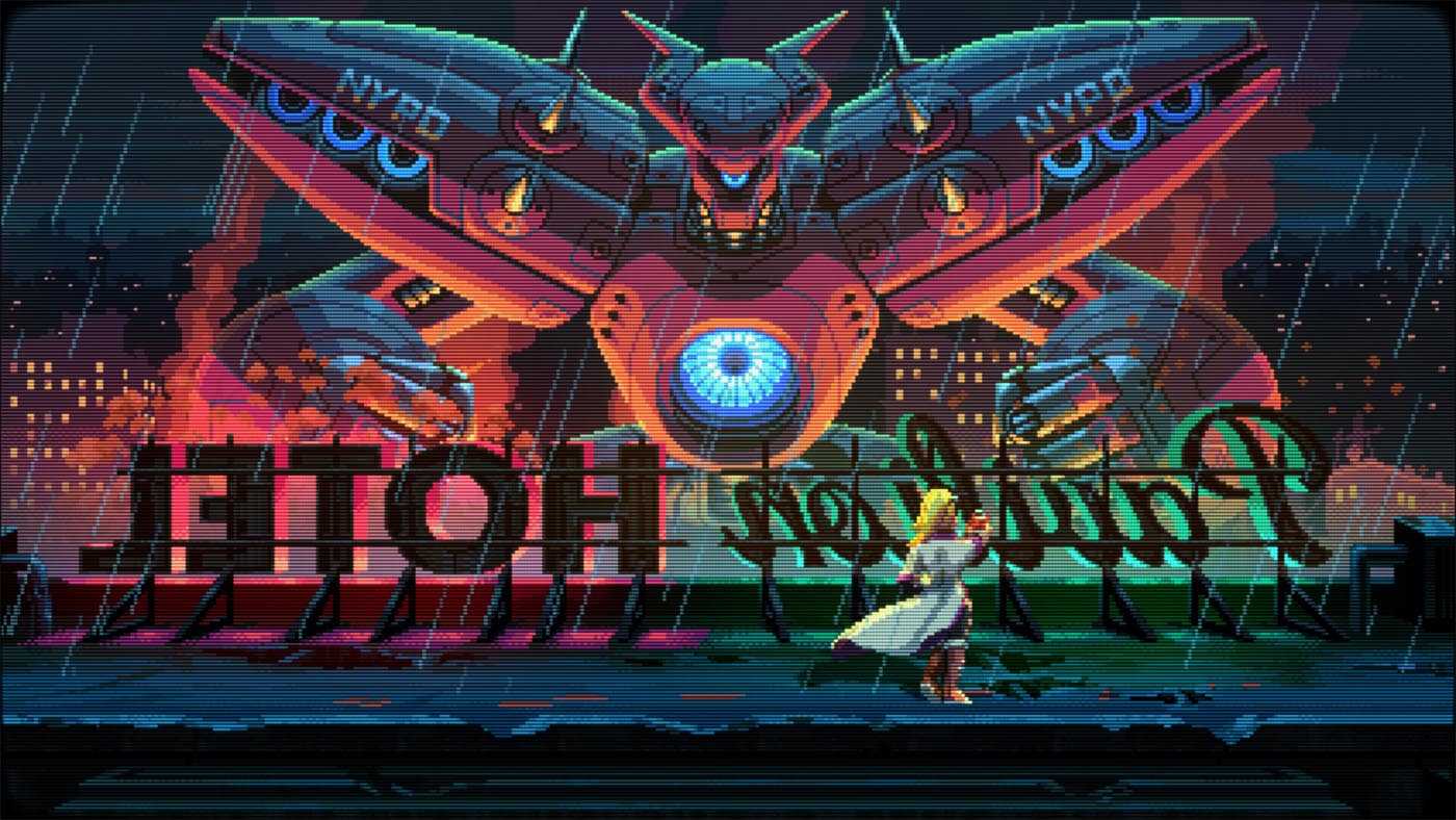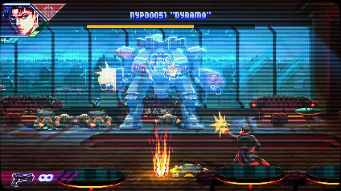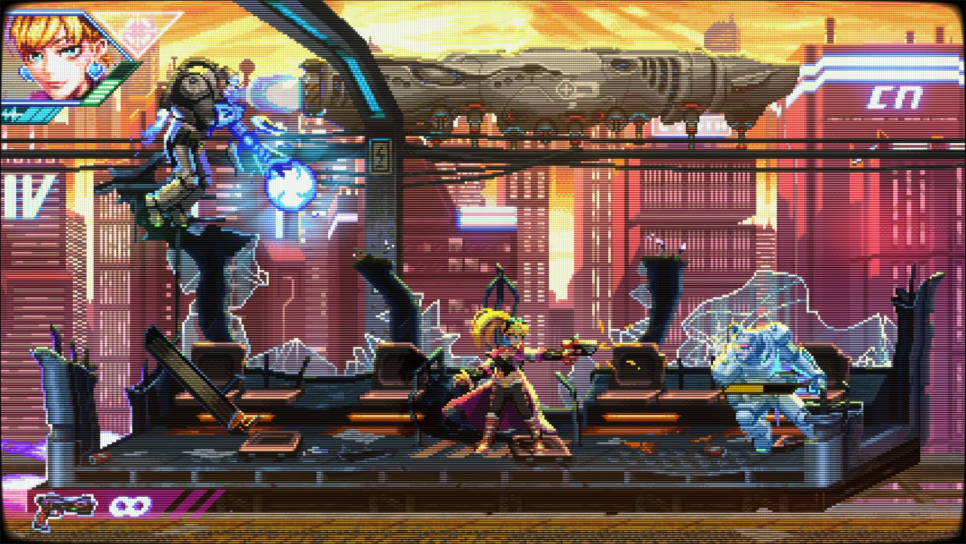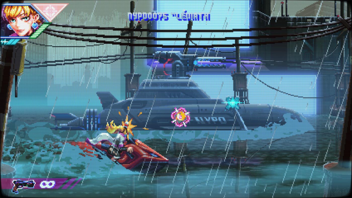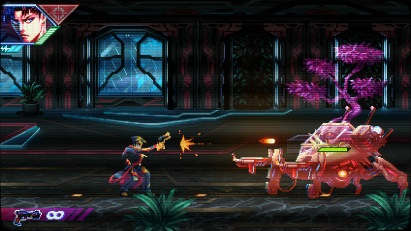 Aussitôt la première mission lancée, Neon Inferno vous jette dans le grand bain. Avec son identité visuelle délicieusement rétro rappelant certains titres aux grandes heures de la Neo-Geo et son univers cyberpunk omniprésent : Éclairages néons, décors urbains délabrés et ambiance dystopique créent une atmosphère qui ne va pas sans rappeler les jeux des années 90. Le style graphique est cohérent, lisible en pleine action et contribue fortement à l’immersion.