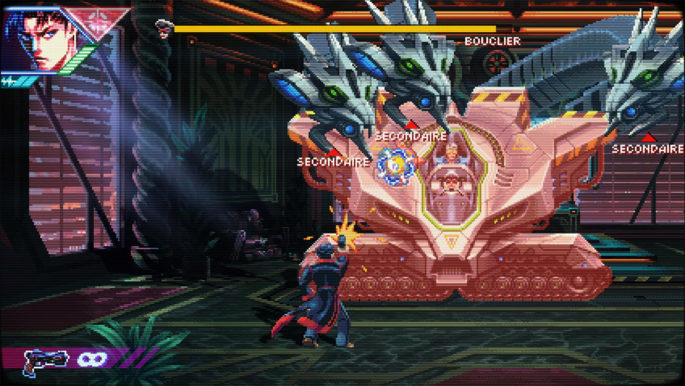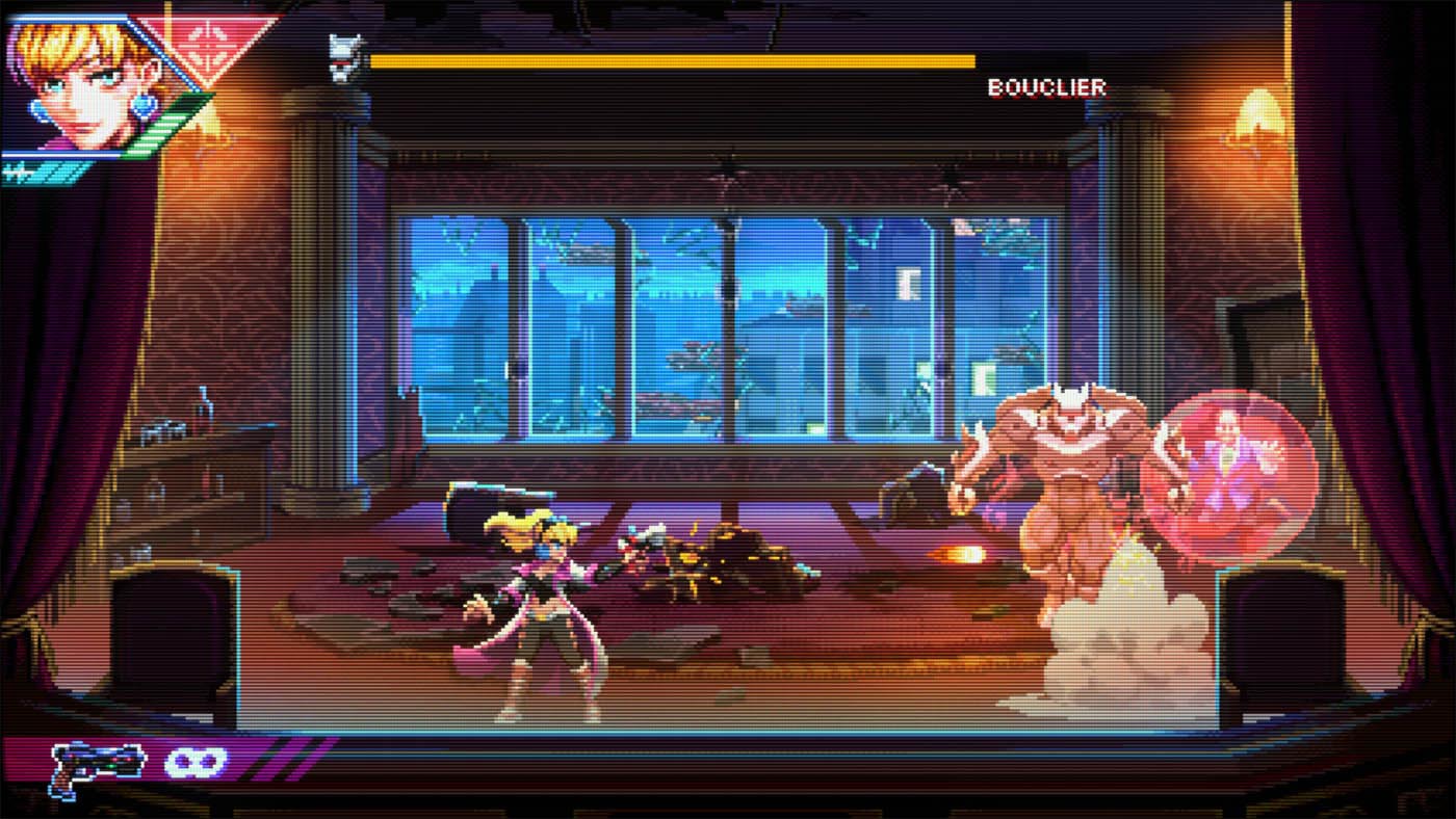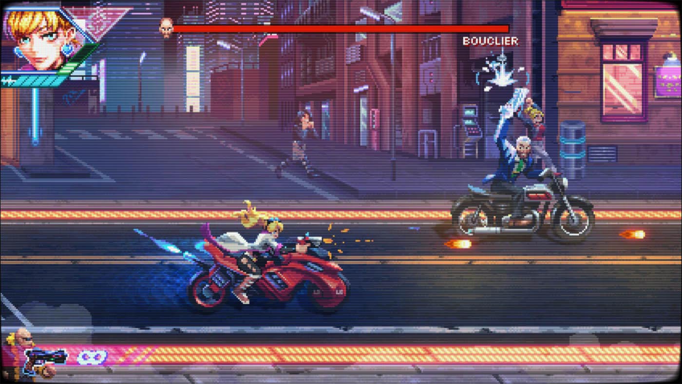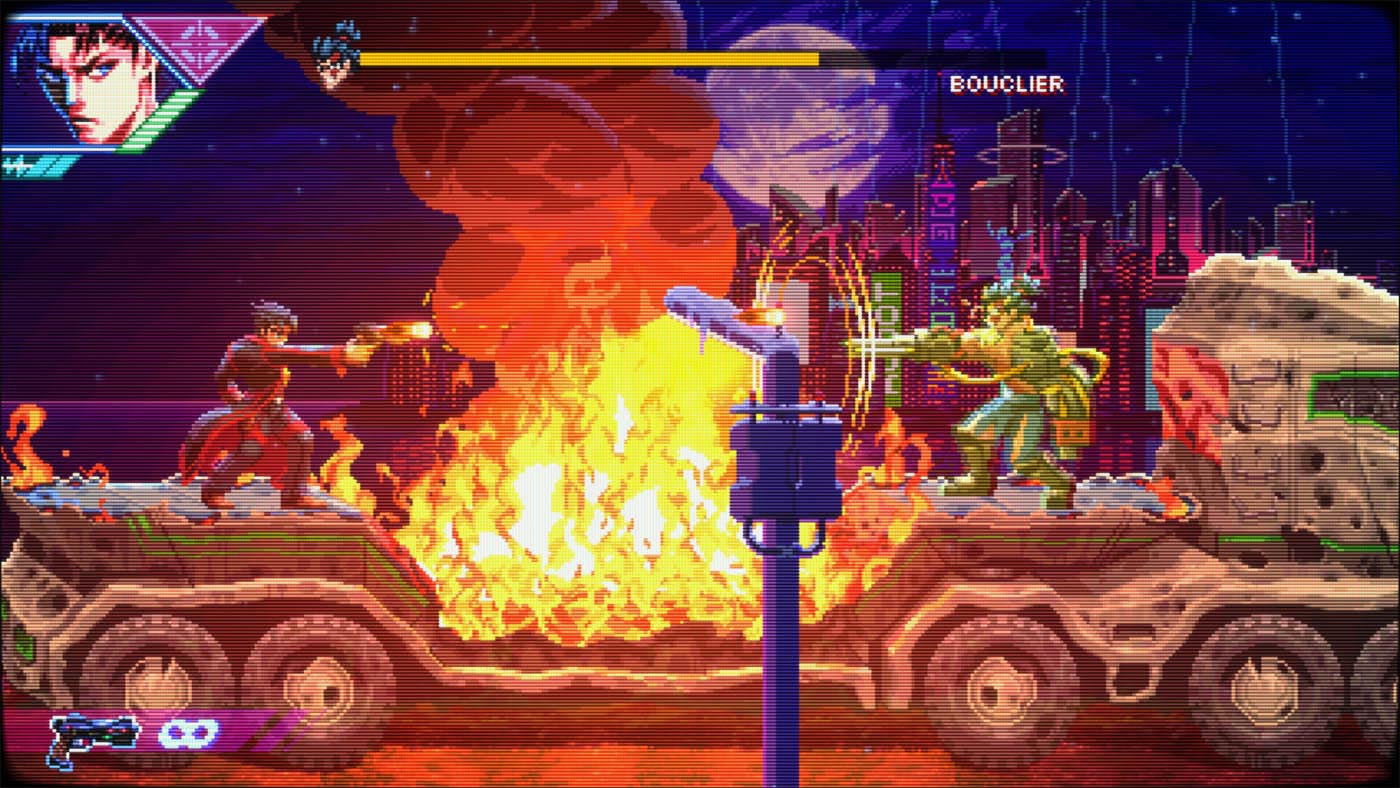 La bande-son, aux faux accents retrowave n’est pas des plus mémorable. Même après avoir terminé le jeu, aucun morceau ne m’est resté en tête. On est loin, très loin des rythmes entrainants d’un bon vieux Metal Slug par exemple.