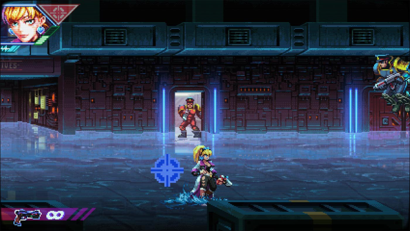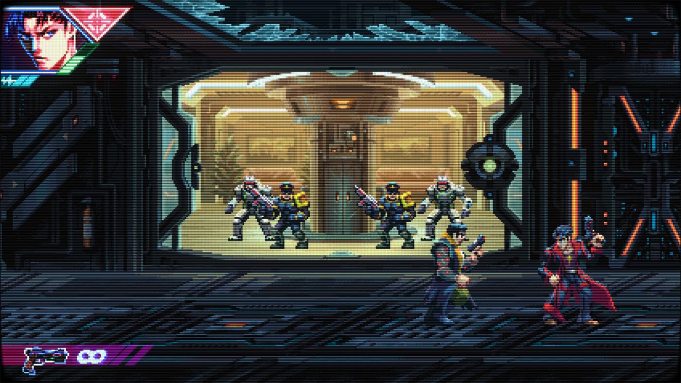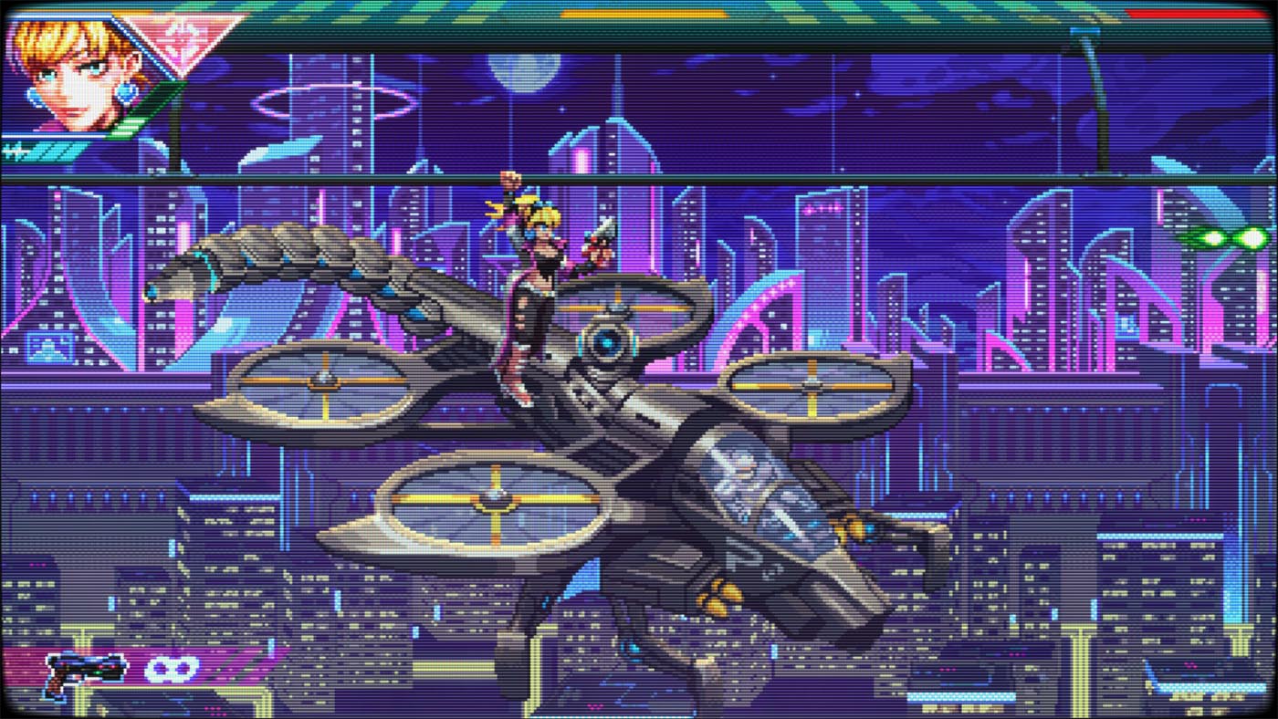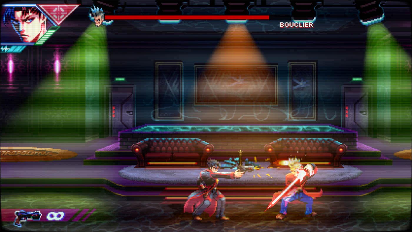La bande-son, aux faux accents retrowave n’est pas des plus mémorable. Même après avoir terminé le jeu, aucun morceau ne m’est resté en tête. On est loin, très loin des rythmes entrainants d’un bon vieux Metal Slug par exemple.